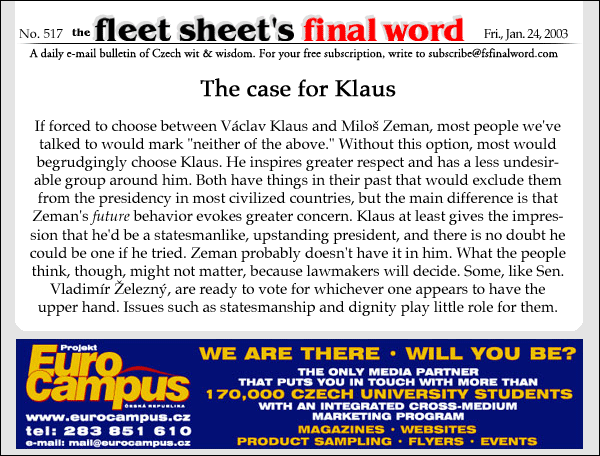 If forced to choose between Václav Klaus and Miloš Zeman, most people we've talked to would mark "neither of the above." Without this option, most would begrudgingly choose Klaus. He inspires greater respect and has a less undesirable group around him. Both have things in their past that would exclude them from the presidency in most civilized countries, but the main difference is that Zeman's future behavior evokes greater concern. Klaus at least gives the impression that he'd be a statesmanlike, upstanding president, and there is no doubt he could be one if he tried. Zeman probably doesn't have it in him. What the people think, though, might not matter, because lawmakers will decide. Some, like Sen. Vladimír Železný, are ready to vote for whichever one appears to have the upper hand. Issues such as statesmanship and dignity play little role for them.