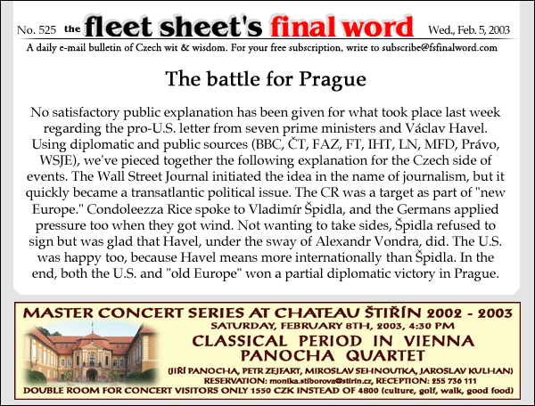 No satisfactory public explanation has been given for what took place last week regarding the pro-U.S. letter on Iraq from seven prime ministers and Václav Havel. Using diplomatic and public sources (BBC, ČT Česká televize, Frankfurter Allgemeine Zeitung FAZ, Financial Times FT, International Herald Tribune IHT, Lidové noviny LN, MF Dnes MFD, Právo, WSJE), we've pieced together the following explanation for the Czech side of events. The Wall Street Journal initiated the idea in the name of journalism, but it quickly became a transatlantic political issue. The CR was a target as part of "new Europe." Condoleezza Rice spoke to Vladimír Špidla, and the Germans applied pressure too when they got wind. Not wanting to take sides, Špidla refused to sign but was glad that Havel, under the sway of Alexandr Vondra, did. The U.S. was happy too, because Havel means more internationally than Špidla. In the end, both the U.S. and "old Europe" won a partial diplomatic victory in Prague.