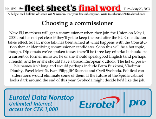 New EU member-countries will get a commissioner when they join the Union on May 1, 2004, but it's not yet clear if they'll get to keep the post after the new EU Constitution takes effect. So far, more discussion has been directed at what happens with the Constitution than at identifying possible candidates for commissioner. Soon this will be a hot topic, though. Diplomats we've spoken to say there'll be three key criteria: 1) it should be a current or former minister; 2) he or she should speak good English (and perhaps French); and 3) he or she should have a broad European outlook. The list of possible names isn't long and would perhaps include Petra Buzková, Vladimír Dlouhý, Pavel Mertlík, Ivan Pilip, Jiří Rusnok and Cyril Svoboda. Political considerations would perhaps eliminate several of them right way. If the future of the Špidla cabinet looks dark around the end of this year, Svoboda might decide he'd like the job.