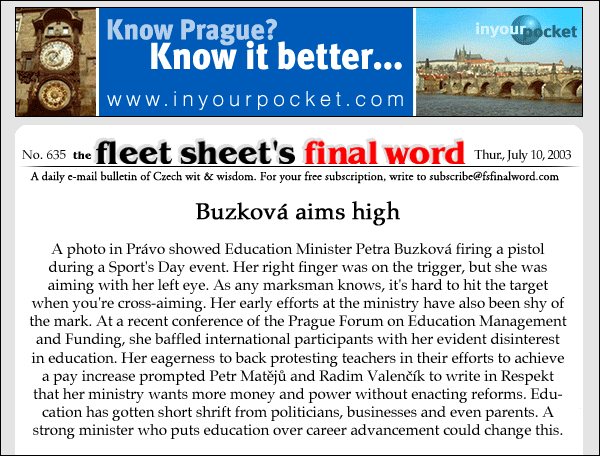 A recent photo in Právo showed Education Minister Petra Buzková firing a pistol during a Sport's Day event. Her right finger was on the trigger, but she was aiming with her left eye. As any marksman knows, it's hard to hit the target when you're cross-aiming. Her early efforts in the education field have also been shy of the mark. At a recent conference of the Prague Forum on Education Management and Funding, she baffled international participants with her evident disinterest in education. Her eagerness to back protesting teachers in their efforts to achieve a pay increase prompted Petr Matějů and Radim Valenčík to write in Respekt that her ministry wants more money and power without enacting reforms. Education has gotten short shrift from politicians, businesses and even parents. A strong minister who puts education over career advancement could change this.
