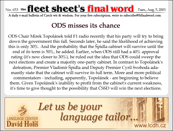 ODS Chairman Mirek Topolánek told F1 radio recently that his party will try to bring down the government this fall. Seconds later, he said the likelihood of achieving this is only 30%. And the probability that the Špidla cabinet will survive until the end of its term is 50%, he added. Earlier, when ODS still had a 40% approval rating (it's now closer to 30%), he ruled out the idea that ODS could sweep the next elections and create a majority one-party cabinet. In contrast to Topolánek's defeatism, Premier Vladimír Špidla and Deputy Premier Cyril Svoboda adamantly state that the cabinet will survive its full term. More and more political commentators - including, apparently, Topolánek - are beginning to believe them. Given Topolánek's inability to profit from the cabinet's current weakness, it's time to give thought to the possibility that ČSSD will win the next elections.