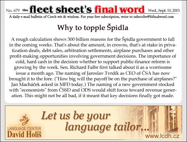 A rough calculation shows 300 billion reasons for the Vladimír Špidla government to fall in the coming weeks. That's about the amount, in crowns, that's at stake in privatization deals, debt sales, arbitration settlements, airplane purchases and other profit-making opportunities involving government decisions. The importance of cold, hard cash in the decision whether to support public-finance reform is growing by the week. Sen. Richard Falbr first talked about it as a worrisome issue a month ago. The naming of Jaroslav Tvrdík as CEO of ČSA has now brought it to the fore. ("How big will the payoff be on the purchase of airplanes?" Jan Macháček asked in MFD Dnes today.) The naming of a new government stocked with "economists" from ČSSD and ODS would shift focus toward revenue generation. This might not be all bad, if it meant that key decisions finally got made. corruption