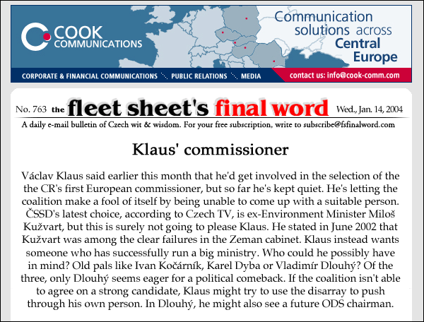 Václav Klaus said earlier this month that he'd get involved in the selection of the the CR's first European commissioner, but so far he's kept quiet. He's letting the coalition make a fool of itself by being unable to come up with a suitable person. ČSSD's latest choice, according to Czech TV Television, is ex-Environment Minister Miloš Kužvart, but this is surely not going to please Klaus. He stated in June 2002 that Kužvart was among the clear failures in the Zeman cabinet. Klaus instead wants someone who has successfully run a big ministry. Who could he possibly have in mind? Old pals like Ivan Kočárník, Karel Dyba or Vladimír Dlouhý? Of the three, only Dlouhý seems eager for a political comeback. If the coalition isn't able to agree on a strong candidate, Klaus might try to use the disarray to push through his own person. In Dlouhý, he might also see a future ODS chairman. Goldman Sachs