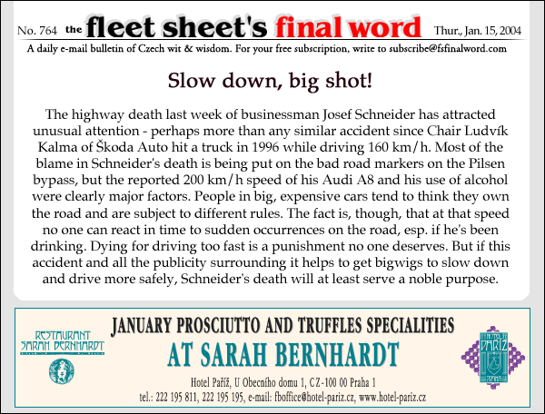 The highway death last week of businessman Josef Schneider has attracted unusual attention - perhaps more than any similar accident since Chair Ludvík Kalma of Škoda Auto hit a truck in 1996 while driving 160 km/h. Most of the blame in Schneider's death is being put on the bad road markers on the Pilsen bypass, but the reported 200 km/h speed of his Audi A8 and his use of alcohol were clearly major factors. People in big, expensive cars tend to think they own the road and are subject to different rules. The fact is, though, that at that speed no one can react in time to sudden occurrences on the road, esp. if he's been drinking. Dying for driving too fast is a punishment no one deserves. But if this accident and all the publicity surrounding it helps to get bigwigs to slow down and drive more safely, Schneider's death will at least serve a noble purpose. traffic driving bad