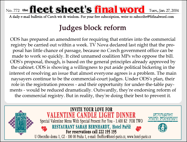 ODS has prepared an amendment for requiring that entries into the commercial registry be carried out within a week. TV Nova declared last night that the proposal has little chance of passage, because no Czech government office can be made to work so quickly. It cited unnamed coalition MPs who oppose the bill. ODS's proposal, though, is based on the general principles already approved by the cabinet. ODS is showing a willingness to put aside political bickering in the interest of resolving an issue that almost everyone agrees is a problem. The main naysayers continue to be the commercial-court judges. Under ODS's plan, their role in the registration process - and their opportunity for under-the-table payments - would be reduced dramatically. Outwardly, they're endorsing reform of the commercial registry. But in reality, they're doing their best to prevent it. register