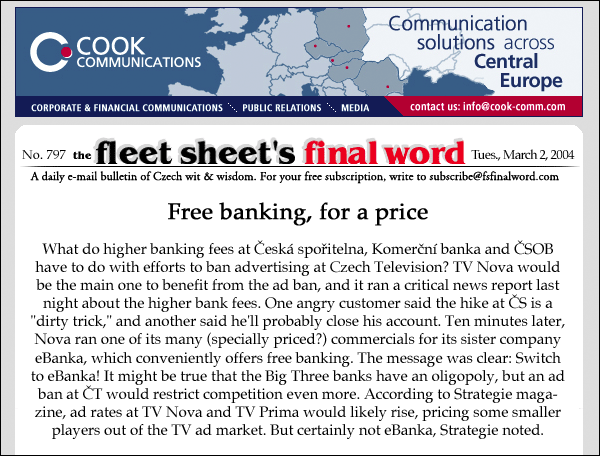What do higher banking fees at Česká spořitelna, Komerční banka and ČSOB have to do with efforts to ban advertising at Czech Television? TV Nova would be the main one to benefit from the ad ban, and it ran a critical news report last night about the higher bank fees. One angry customer said the hike at ČS is a "dirty trick," and another said he'll probably close his account. Ten minutes later, Nova ran one of its many (specially priced?) commercials for its sister company eBanka, which conveniently offers free banking. The message was clear: Switch to eBanka! It might be true that the Big Three banks have an oligopoly, but an ad ban at ČT would restrict competition even more. According to Strategie magazine, ad rates at TV Nova and TV Prima would likely rise, pricing some smaller players out of the TV ad market. But certainly not eBanka, Strategie added. PPF