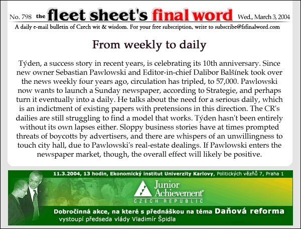 Týden, a success story in recent years, is celebrating its 10th anniversary. Since new owner Sebastian Pawlowski and Editor-in-chief Dalibor Balšínek took over the news weekly four years ago, circulation has tripled, to 57,000. Pawlowski now wants to launch a Sunday newspaper, according to Strategie, and perhaps turn it eventually into a daily. He talks about the need for a serious daily, which is an indictment of existing papers with pretensions in this direction. The CR's dailies are still struggling to find a model that works. Týden hasn't been entirely without its own lapses either. Sloppy business stories have at times prompted threats of boycotts by advertisers, and there are whispers of an unwillingness to touch city hall, due to Pawlowski's real-estate dealings. If Pawlowski enters the newspaper market, though, the overall effect will likely be positive. Prague