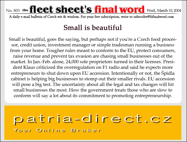 Small is beautiful, goes the saying, but perhaps not if you're a Czech food processor, credit union, investment manager or simple tradesman running a business from your home. Tougher rules meant to conform to the EU, protect consumers, raise revenue and prevent tax evasion are chasing small businesses out of the market. In Jan.-Feb. alone, 24,000 sole proprietors turned in their licenses. President Václav Klaus criticized the overregulation on F1 radio and said he expects more entrepreneurs to shut down upon EU accession. Intentionally or not, the Špidla cabinet is helping big businesses to stomp out their smaller rivals. EU accession will pose a big test. The uncertainty about all the legal and tax changes will hit small businesses the most. How the government treats those who are slow to conform will say a lot about its commitment to promoting entrepreneurship.