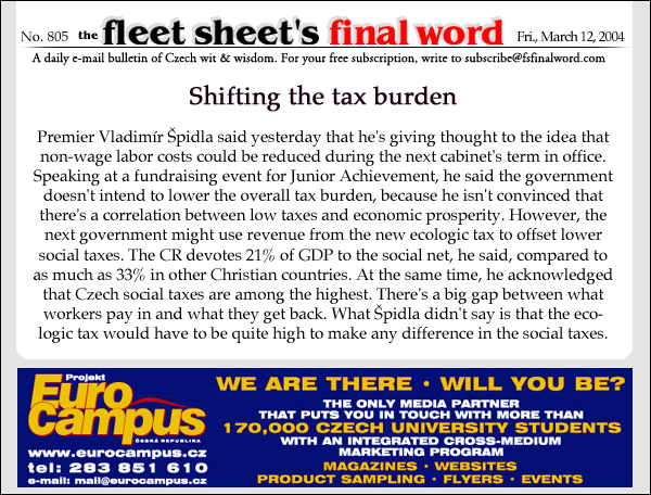 Premier Vladimír Špidla said yesterday that he's giving thought to the idea that non-wage labor costs could be reduced during the next cabinet's term in office. Speaking at a fundraising event for Junior Achievement, he said the government doesn't intend to lower the overall tax burden, because he isn't convinced that there's a correlation between low taxes and economic prosperity. However, the next government might use revenue from the new ecologic tax to offset lower social taxes. The CR devotes 21% of GDP to the social net, he said, compared to as much as 33% in other Christian countries. At the same time, he acknowledged that Czech social taxes are among the highest. There's a big gap between what workers pay in and what they get back. What Špidla didn't say is that the ecologic tax would have to be quite high to make any difference in the social taxes. security