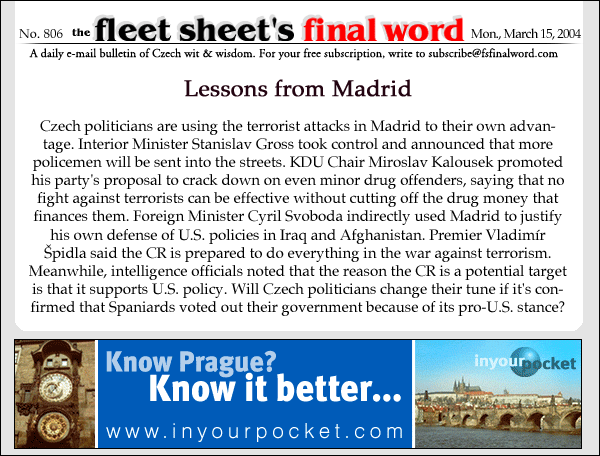 Czech politicians are using the terrorist attacks in Madrid to their own advantage. Interior Minister Stanislav Gross took control and announced that more policemen will be sent into the streets. KDU-ČSL Chair Miroslav Kalousek promoted his party's proposal to crack down on even minor drug offenders, saying that no fight against terrorists can be effective without cutting off the drug money that finances them. Foreign Minister Cyril Svoboda indirectly used Madrid to justify his own defense of U.S. policies in Iraq and Afghanistan. Premier Vladimír Špidla said the CR is prepared to do everything in the war against terrorism. Meanwhile, intelligence officials noted that the reason the CR is a potential target is that it supports U.S. policy. Will Czech politicians change their tune if it's confirmed that Spaniards voted out their government because of its pro-U.S. stance?