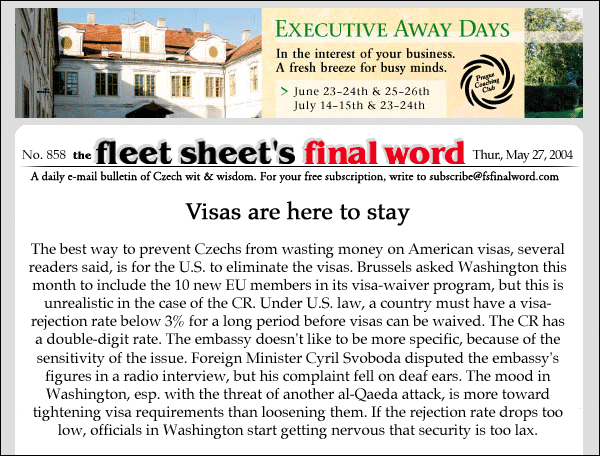The best way to prevent Czechs from wasting money on American visas, several readers said, is for the U.S. to eliminate the visas. Brussels asked Washington this month to include the 10 new EU members in its visa-waiver program, but this is unrealistic in the case of the CR. Under U.S. law, a country must have a visa-rejection rate below 3% for a long period before visas can be waived. The CR has a double-digit rate. The embassy doesn't like to be more specific, because of the sensitivity of the issue. Foreign Minister Cyril Svoboda disputed the embassy's figures in a radio interview, but his complaint fell on deaf ears. The mood in Washington, esp. with the threat of another al-Qaeda attack, is more toward tightening visa requirements than loosening them. If the rejection rate drops too low, officials in Washington start getting nervous that security is too lax. requirement