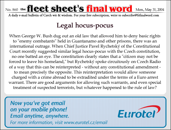 When George W. Bush dug out an old law that allowed him to deny basic rights to "enemy combatants" held in Guantanamo and other prisons, there was an international outrage. When Chief Justice Pavel Rychetský of the Constitutional Court recently suggested similar legal hocus-pocus with the Czech constitution, no one batted an eye. The constitution clearly states that a "citizen may not be forced to leave his homeland," but Rychetský spoke circuitously on Czech Radio of a way that this can be reinterpreted - without any constitutional amendment - to mean precisely the opposite. This reinterpretation would allow someone charged with a crime abroad to be extradited under the terms of a Euro arrest warrant. There are good arguments for allowing such warrants, and even special treatment of suspected terrorists, but whatever happened to the rule of law? European U.S.