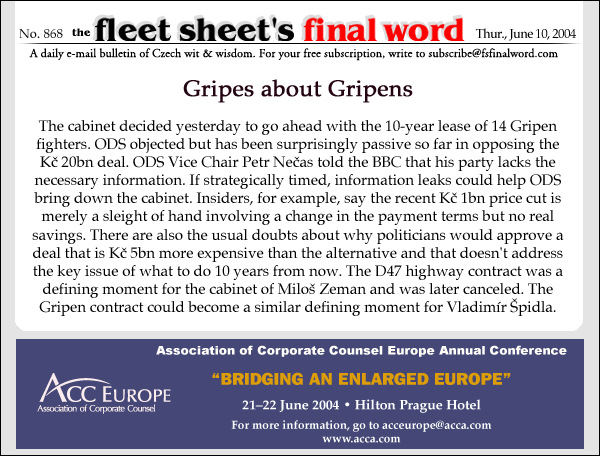 The cabinet decided yesterday to go ahead with the 10-year lease of 14 Gripen fighters. ODS objected but has been surprisingly passive so far in opposing the Kč 20bn deal. ODS Vice Chair Petr Nečas told the BBC that his party lacks the necessary information. If strategically timed, information leaks could help ODS bring down the cabinet. Insiders, for example, say the recent Kč 1bn price cut is merely a sleight of hand involving a change in the payment terms but no real savings. There are also the usual doubts about why politicians would approve a deal that is Kč 5bn more expensive than the alternative and that doesn't address the key issue of what to do 10 years from now. The D47 highway contract was a defining moment for the cabinet of Miloš Zeman and was later canceled. The Gripen contract could become a similar defining moment for Vladimír Špidla. supersonic ČSSD