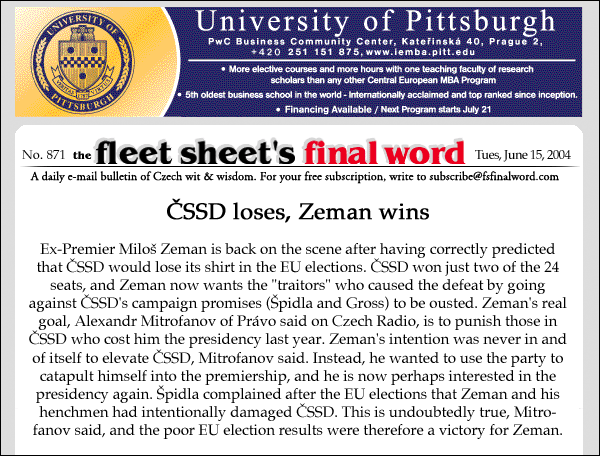 Ex-Premier Miloš Zeman is back on the scene after having correctly predicted that ČSSD would lose its shirt in the EU elections. ČSSD won just two of the 24 seats, and Zeman now wants the "traitors" who caused the defeat by going against ČSSD's campaign promises (Vladimír Špidla and Stanislav Gross) to be ousted. Zeman's real goal, Alexandr Mitrofanov of Právo said on Czech Radio, is to punish those in ČSSD who cost him the presidency last year. Zeman's intention was never in and of itself to elevate ČSSD, Mitrofanov said. Instead, he wanted to use the party to catapult himself into the premiership, and he is now perhaps interested in the presidency again. Špidla complained after the EU elections that Zeman and his henchmen had intentionally damaged ČSSD. This is undoubtedly true, Mitrofanov said, and the poor EU election results were therefore a victory for Zeman. European Parliament