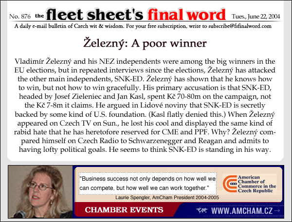 Vladimír Železný and his NEZ independents were among the big winners in the EU elections, but in repeated interviews since the elections, Železný has attacked the other main independents, SNK-ED. Železný has shown that he knows how to win, but not how to win gracefully. His primary accusation is that SNK-ED, headed by Josef Zieleniec and Jan Kasl, spent Kč 70-80m on the campaign, not the Kč 7-8m it claims. He argued in Lidové noviny that SNK-ED is secretly backed by some kind of U.S. foundation. (Kasl flatly denied this.) When Železný appeared on Czech TV on Sun., he lost his cool and displayed the same kind of rabid hate that he has heretofore reserved for CME and PPF. Why? Železný compared himself on Czech Radio to Schwarzenegger and Reagan and admits to having lofty political goals. He seems to think SNK-ED is standing in his way. Arnold Ronald