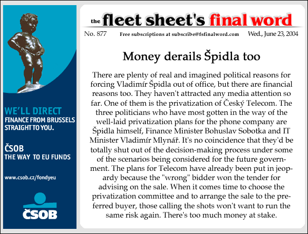 There are plenty of real and imagined political reasons for forcing Vladimír Špidla out of office, but there are financial reasons too. They haven't attracted any media attention so far. One of them is the privatization of Český Telecom. The three politicians who have most gotten in the way of the well-laid privatization plans for the phone company are Špidla himself, Finance Minister Bohuslav Sobotka and IT Minister Vladimír Mlynář. It's no coincidence that they'd be totally shut out of the decision-making process under some of the scenarios being considered for the future government. The plans for Telecom have already been put in jeopardy because the "wrong" bidder won the tender for advising on the sale. When it comes time to choose the privatization committee and to arrange the sale to the preferred buyer, those calling the shots won't want to run the same risk again. There's too much money at stake.