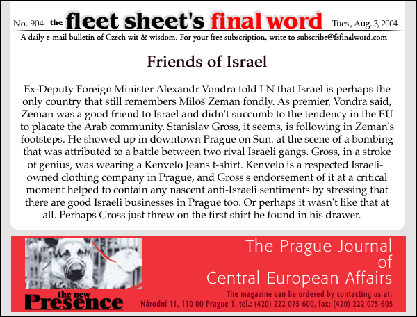 Ex-Deputy Foreign Minister Alexandr Vondra told LN that Israel is perhaps the only country that still remembers Miloš Zeman fondly. As premier, Vondra said, Zeman was a good friend to Israel and didn't succumb to the tendency in the EU to placate the Arab community. Stanislav Gross, it seems, is following in Zeman's footsteps. He showed up in downtown Prague on Sun. at the scene of a bombing that was attributed to a battle between two rival Israeli gangs. Gross, in a stroke of genius, was wearing a Kenvelo Jeans t-shirt. Kenvelo is a respected Israeli-owned clothing company in Prague, and Gross's endorsement of it at a critical moment helped to contain any nascent anti-Israeli sentiments by stressing that there are good Israeli businesses in Prague too. Or perhaps it wasn't like that at all. Perhaps Gross just threw on the first shirt he found in his drawer. Lidové novinyArab-Israeli conflict