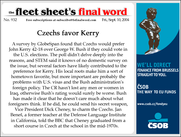 A survey by GlobeSpan found that Czechs would prefer John Kerry 42-18 over George W. Bush if they could vote in the U.S. elections. The poll didn't delve deeply into the reasons, and STEM said it knows of no domestic survey on the issue, but several factors have likely contributed to the preference for Kerry. His local roots make him a sort of hometown favorite, but more important are probably the problems with U.S. visas and the Bush administration's foreign policy. The CR hasn't lost any men or women in Iraq, otherwise Bush's rating would surely be worse. Bush has made it clear that he doesn't care much about what foreigners think. If he did, he could send his secret weapon, Vice President Dick Cheney, to charm the Czechs. Jan Beneš, a former teacher at the Defense Language Institute in California, told the BBC that Cheney graduated from a short course in Czech at the school in the mid-1970s. Richard
