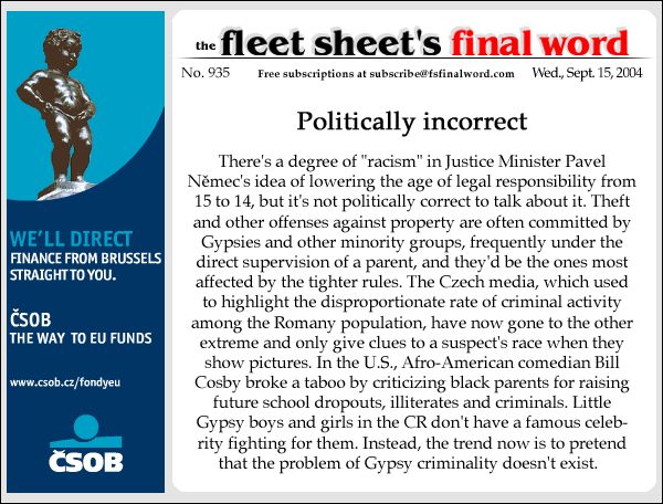 There's a degree of "racism" in Justice Minister Pavel Němec's idea of lowering the age of legal responsibility from 15 to 14, but it's not politically correct to talk about it. Theft and other offenses against property are often committed by Gypsies and other minority groups, frequently under the direct supervision of a parent, and they'd be the ones most affected by the tighter rules. The Czech media, which used to highlight the disproportionate rate of criminal activity among the Romany population, have now gone to the other extreme and only give clues to a suspect's race when they show pictures. In the U.S., Afro-American comedian Bill Cosby broke a taboo by criticizing black parents for raising future school dropouts, illiterates and criminals. Little Gypsy boys and girls in the CR don't have a famous celebrity fighting for them. Instead, the trend now is to pretend that the problem of Gypsy criminality doesn't exist. crime