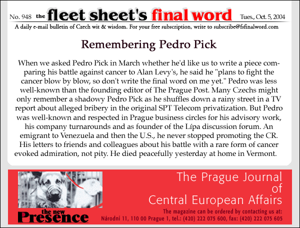 When we asked Pedro Pick in March whether he'd like us to write a piece comparing his battle against cancer to Alan Levy's, he said he "plans to fight the cancer blow by blow, so don't write the final word on me yet." Pedro was less well-known than the founding editor of The Prague Post. Many Czechs might only remember a shadowy Pedro Pick as he shuffles down a rainy street in a TV report about alleged bribery in the original SPT Telecom privatization. But Pedro was well-known and respected in Prague business circles for his advisory work, his company turnarounds and as founder of the Lípa discussion forum. An emigrant to Venezuela and then the U.S., he never stopped promoting the CR. His letters to friends and colleagues about his battle with a rare form of cancer evoked admiration, not pity. He died peacefully yesterday at home in Vermont. Český Telecom