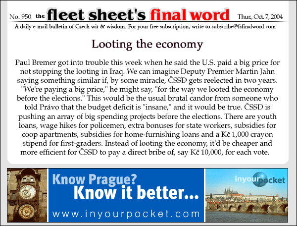 Paul Bremer got into trouble this week when he said the U.S. paid a big price for not stopping the looting in Iraq. We can imagine Deputy Premier Martin Jahn saying something similar if, by some miracle, ČSSD gets reelected in two years. "We're paying a big price," he might say, "for the way we looted the economy before the elections." This would be the usual brutal candor from someone who told Právo that the budget deficit is "insane," and it would be true. ČSSD is pushing an array of big spending projects before the elections. There are youth loans, wage hikes for policemen, extra bonuses for state workers, subsidies for coop apartments, subsidies for home-furnishing loans and a Kč 1,000 crayon stipend for first-graders. Instead of looting the economy, it'd be cheaper and more efficient for ČSSD to pay a direct bribe of, say Kč 10,000, for each vote. subsidy