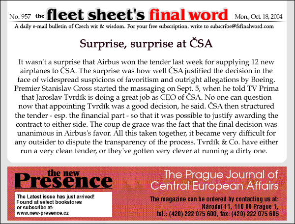 It wasn't a surprise that Airbus won the tender last week for supplying 12 new airplanes to ČSA. The surprise was how well ČSA justified the decision in the face of widespread suspicions of favoritism and outright allegations by Boeing. Premier Stanislav Gross started the massaging on Sept. 5, when he told TV Prima that Jaroslav Tvrdík is doing a great job as CEO of ČSA. No one can question now that appointing Tvrdík was a good decision, he said. ČSA then structured the tender - esp. the financial part - so that it was possible to justify awarding the contract to either side. The coup de grace was the fact that the final decision was unanimous in Airbus's favor. All this taken together, it became very difficult for any outsider to dispute the transparency of the process. Tvrdík & Co. have either run a very clean tender, or they've gotten very clever at running a dirty one. aircraft