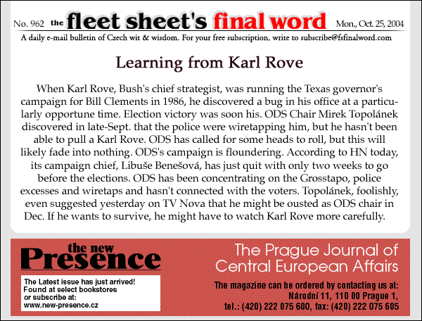When Karl Rove, George W. Bush's chief strategist, was running the Texas governor's campaign for Bill Clements in 1986, he discovered a bug in his office at a particularly opportune time. Election victory was soon his. ODS Chair Mirek Topolánek discovered in late-Sept. that the police were wiretapping him, but he hasn't been able to pull a Karl Rove. ODS has called for some heads to roll, but this will likely fade into nothing. ODS's campaign is floundering. According to HN today, its campaign chief, Libuše Benešová, has just quit with only two weeks to go before the elections. ODS has been concentrating on the Grosstapo, police excesses and wiretaps and hasn't connected with the voters. Topolánek, foolishly, even suggested yesterday on TV Nova that he might be ousted as ODS chair in Dec. If he wants to survive, he might have to watch Karl Rove more carefully. eavesdropping