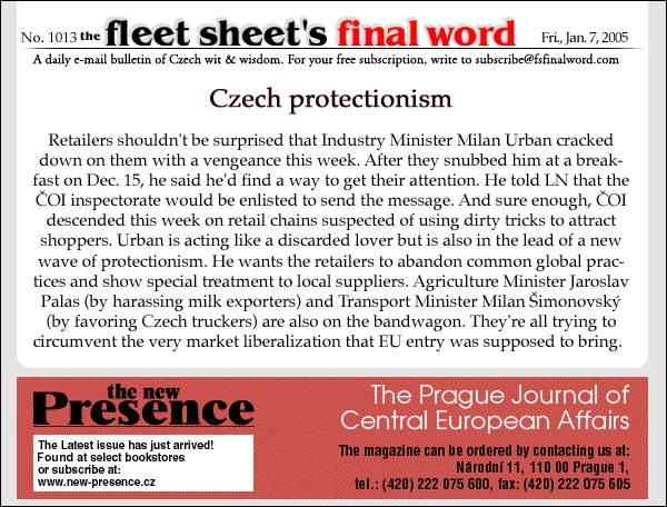 Retailers shouldn't be surprised that Industry Minister Milan Urban cracked down on them with a vengeance this week. After they snubbed him at a breakfast on Dec. 15, he said he'd find a way to get their attention. He told LN that the ČOI commercial inspectorate would be enlisted to send the message. And sure enough, ČOI descended this week on retail chains suspected of using dirty tricks to attract shoppers. Urban is acting like a discarded lover but is also in the lead of a new wave of protectionism. He wants the retailers to abandon common global practices and show special treatment to local suppliers. Agriculture Minister Jaroslav Palas (by harassing milk exporters) and Transport Minister Milan Šimonovský (by favoring Czech truckers) are also on the bandwagon. They're all trying to circumvent the very market liberalization that EU entry was supposed to bring. [international foreigners Czech Republic competition hypermarkets]