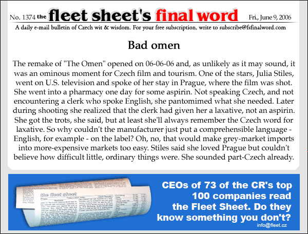 The remake of "The Omen" opened on 06-06-06 and, as unlikely as it may sound, it was an ominous moment for Czech film and tourism. One of the stars, Julia Stiles, went on U.S. television and spoke of her stay in Prague, where the film was shot. She went into a pharmacy one day for some aspirin. Not speaking Czech, and not encountering a clerk who spoke English, she pantomimed what she needed. Later during shooting she realized that the clerk had given her a laxative, not an aspirin. She got the trots, she said, but at least she'll always remember the Czech word for laxative. So why couldn't the manufacturer just put a comprehensible language - English, for example - on the label? Oh, no, that would make grey-market imports into more-expensive markets too easy. Stiles said she loved Prague but couldn't believe how difficult little, ordinary things were. She sounded part-Czech already.[Czech Republic filmmaking cinema]