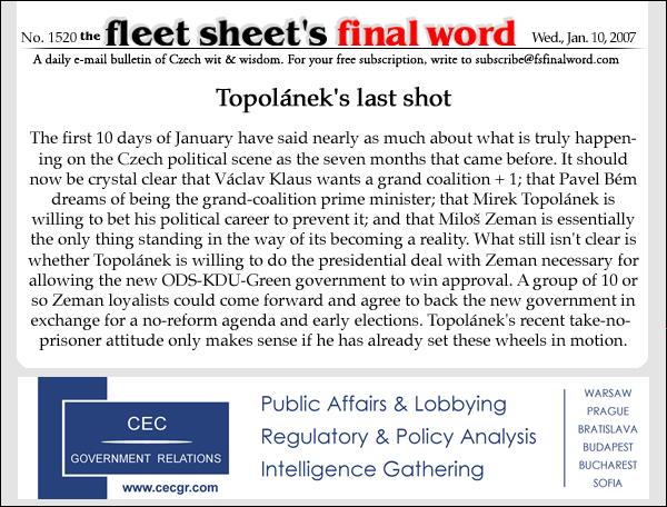 The first 10 days of January have said nearly as much about what is truly happening on the Czech political scene as the seven months that came before. It should now be crystal clear that Václav Klaus wants a grand coalition + 1; that Pavel Bém dreams of being the grand-coalition prime minister; that Mirek Topolánek is willing to bet his political career to prevent it; and that Miloš Zeman is essentially the only thing standing in the way of its becoming a reality. What still isn't clear is whether Topolánek is willing to do the presidential deal with Zeman necessary for allowing the new ODS-KDU-Green government to win approval. A group of 10 or so Zeman loyalists could come forward and agree to back the new government in exchange for a no-reform agenda and early elections. Topolánek's recent take-no-prisoner attitude only makes sense if he has already set these wheels in motion. [Czech Republic KDU-ČSL plus one premier]