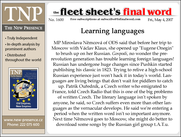MP Miroslava Němcová of ODS said that before her trip to Moscow with Václav Klaus, she opened up "Eugene Onegin" to brush up on her Russian. Gospodi, no wonder the pre-revolution generation has trouble learning foreign languages! Russian has undergone huge changes since Pushkin started publishing his classic in 1823. Trying to relive a high-school Russian experience just won't hack it in today's world. Languages are living beings that don't wait for piddlers to catch up. Patrik Ouředník, a Czech writer who emigrated to France, told Czech Radio that this is one of the big problems of written Czech. The literary language isn't spoken by anyone, he said, so Czech suffers even more than other languages as the vernacular develops. He said we're entering a period when the written word isn't so important anymore. Next time Němcová goes to Moscow, she might do better to download some songs by the Russian girl group t.A.T.u.[Czech Republic study Vladimir Putin president Alexander]